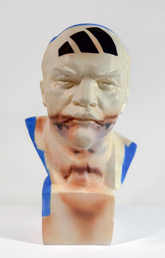 The replica of an old painted sculpture draws inspiration from the internet and the Soviet myth, presenting itself as a tribute to the latter. The head of Lenin, founder of the Soviet Union in 1918, is reinterpreted and takes on a new iconographic identity.